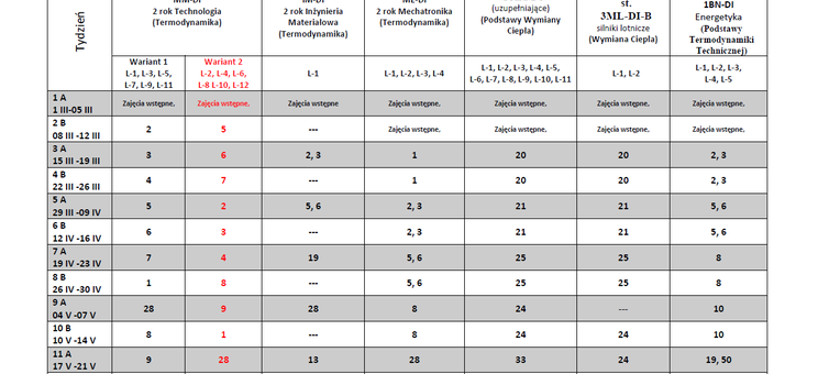 Harmonogram zajęć laboratoryjnych realizowanych w Zakładzie Termodynamiki w semestrze letnim 2020/2021.
